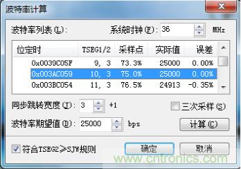 了解設(shè)置波特率的原則后,我們采用ZLG的波特率計(jì)算軟件,對(duì)25kbps波特率的設(shè)置參數(shù)進(jìn)行計(jì)算,計(jì)算結(jié)果如圖3。