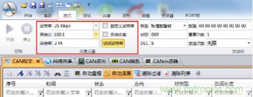 l自動(dòng)波特率識(shí)別:采用CANScope自動(dòng)偵測(cè)波特率的功能,對(duì)CAN卡的波特率進(jìn)行識(shí)別,識(shí)別結(jié)果為25kbps;
