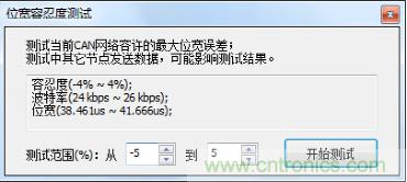 l位寬容忍度測(cè)試:采用CANScope對(duì)當(dāng)前波特率下CAN卡進(jìn)行位寬容忍度測(cè)試,測(cè)試其對(duì)波特率的容忍度情況,測(cè)試結(jié)果為24kbps~26kbps,容忍度情況較好;