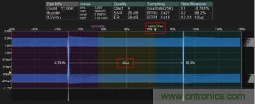 l位時(shí)間測(cè)試:用CANScope的眼圖功能對(duì)當(dāng)前波特率下CAN卡進(jìn)行位時(shí)間測(cè)試,位時(shí)間為40us,與25kbps波特率的位時(shí)間相符。