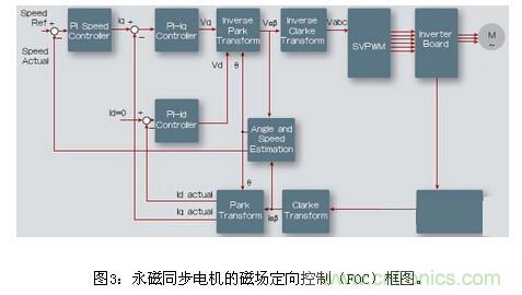 (1)電機(jī)控制IP模塊。圖3為無傳感器磁場定向控制算法,這一部分將會討論這些模塊,它們作為IP核提供。
