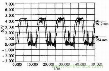 在高速數(shù)字電路的設(shè)計(jì)中,除了阻抗匹配外,部分器件對傳輸線的長度有著嚴(yán)格的要求,信號頻率越高,要求傳輸線的長度越短。以X1器件和X2器件為例建立仿真模型如圖3所示。在仿真模型中加了33Ω的匹配電阻,選擇仿真信號頻率為66MHz方波,改變傳輸線長度分別為76.2mm和254mm時(shí)進(jìn)行仿真。仿真結(jié)果如圖4所示。