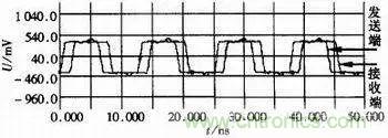 在實(shí)際的PCB布線時(shí),如果由于產(chǎn)品結(jié)構(gòu)的需要,不能縮短信號線長度時(shí),應(yīng)采用差分信號傳輸。差分信號有很強(qiáng)的抗共模干擾能力,能大大延長傳輸距離。差分信號有很多種,如ECL、PECL、LVDS等,表1列出LVDS相對于ECL、PECL系統(tǒng)的主要特點(diǎn)。LVDS的恒流源模式低擺幅輸出使得LVDS能高速驅(qū)動(dòng),對于點(diǎn)到的連接,傳輸速率可達(dá)800Mbps,同時(shí)LVDS低噪聲、低功耗,連接方便,實(shí)際中使用較多。LVDS的驅(qū)動(dòng)器由一個(gè)通常為3.5mA的恒流源驅(qū)動(dòng)對差分信號線組成。接收端有一個(gè)高的直流輸入阻抗,幾科全部的驅(qū)動(dòng)電流流經(jīng)10Ω的終端電阻,在接收器輸入端產(chǎn)生約350mV電壓。當(dāng)驅(qū)動(dòng)狀態(tài)反轉(zhuǎn)時(shí),流經(jīng)電阻的電流方向改變,此時(shí)在接收端產(chǎn)生有效的邏輯狀態(tài)。圖5是利用LVDS芯片DS90LV031、DS90LV032把信號轉(zhuǎn)換成差分信號,進(jìn)行長距離傳輸?shù)牟ㄐ螆D。在仿真時(shí)設(shè)置仿真頻率為66MHz理想方波,傳輸距離為508mm,差分對終端接100Ω負(fù)載匹配傳輸線的差分阻抗。從仿真結(jié)果看,LVDS接收端的波形除了有延遲外,波形保持完好。
