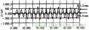 由于頻率的提高,傳輸線之間的串?dāng)_明顯增大,對信號完整性也有很大的影響,可以通過仿真來預(yù)測、模擬,并采取措施加以改善。以CMOS信號為例建立仿真模型,如圖6所示。在仿真時(shí)設(shè)置干擾信號的頻率為66MHz的方波,被干擾者設(shè)置為零電平輸入,通過調(diào)整兩根線的間距和兩線之間平行走線的長度來觀察被干擾者接收端的波形。仿真結(jié)果如圖7,分別為間距是203.2mm、406。4mm時(shí)的波形。