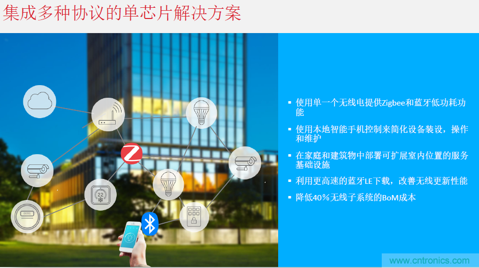 陳雄基以藍(lán)牙5的Mesh網(wǎng)絡(luò)和智能家居,尤其是智能照明中常用的ZigBee網(wǎng)絡(luò)為例,作了詳細(xì)的說明。就在一個(gè)多月前 Silicon Labs 為其Wireless Gecko片上系統(tǒng)(SoC)和模塊產(chǎn)品組合發(fā)布了新的動態(tài)多協(xié)議軟件,可同時(shí)在單一SoC上運(yùn)行zigbee和低功耗藍(lán)牙(Bluetooth low energy),匯集了這兩種協(xié)議的關(guān)鍵應(yīng)用優(yōu)勢。這種多協(xié)議解決方案可實(shí)現(xiàn)物聯(lián)網(wǎng)(IoT)應(yīng)用的高級功能,且不會帶來雙芯片架構(gòu)的額外復(fù)雜性和硬件成本,從而將無線子系統(tǒng)物料清單(BOM)成本和尺寸降低達(dá)40%。