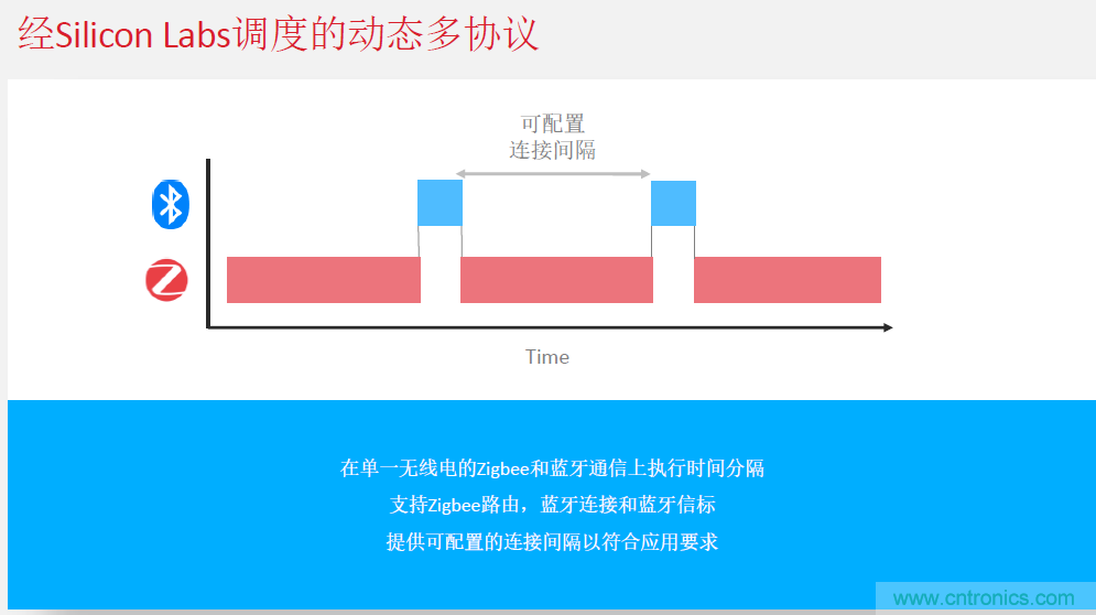 Silicon Labs在芯片設(shè)計(jì)時(shí),就提出了動態(tài)多協(xié)議的做法。即:在單一無線電的Zigbee和藍(lán)牙通信上執(zhí)行時(shí)間分隔,支持Zigbee路由、藍(lán)牙連接和藍(lán)牙信標(biāo)。為工程師提供可配置的連接間隔,以符合應(yīng)用要求。陳雄基表示,目前這種做法據(jù)他所知Silicon Labs是業(yè)界唯一已經(jīng)在技術(shù)上實(shí)現(xiàn)的公司。