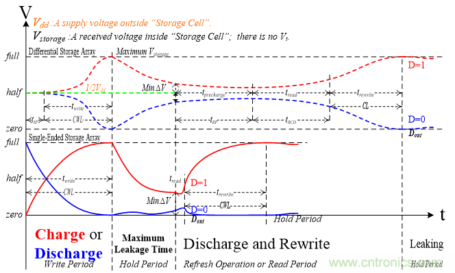 如果說(shuō)3T DRAM是第一代DRAM技術(shù),使用差動(dòng)放大器實(shí)現(xiàn)讀取功能的1T DRAM是第二代DRAM,那么在本文中的第三代DRAM技術(shù)是指取代差動(dòng)放大器且大幅提升讀取功能的存取技術(shù)。1T DRAM的內(nèi)存基本單位是由一晶體管和一電容器所組成的儲(chǔ)存單元,又稱為1T DRAM單元。圖3顯示在單一儲(chǔ)存單元上進(jìn)行存取操作的波形,上半部分是使用差動(dòng)放大器的第二代技術(shù),下半部分是第三代技術(shù),此圖主要用于比較這二者完成讀取操作所需花費(fèi)的最長(zhǎng)時(shí)間。當(dāng)這一電容器的儲(chǔ)存電壓(Vstorage)放電達(dá)到最小差異電壓(Min. ?V)時(shí)就必須立即進(jìn)行更新操作(即讀取),所以此圖呈現(xiàn)有關(guān)讀取操作的最長(zhǎng)時(shí)間就等于是更新操作的最長(zhǎng)時(shí)間。圖中標(biāo)示有tprecharge、tread、trewrite、twrite,這些技術(shù)用語(yǔ)依序?qū)?yīng)產(chǎn)品規(guī)格的tRP、tRCD、CL與CWL。第三代技術(shù)無(wú)需tRP,除此之外,tRCD也很短暫且可由CWL替換CL,因此訪問(wèn)速度接近SRAM,存取效率低于SRAM。
