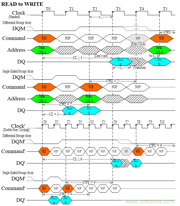 圖4用于觀察SDRAM的命令序列對(duì)于不同存取技術(shù)所發(fā)生的變化,此圖用于比較第二代與第三代技術(shù)之間的存取效率。SDRAM的命令序列有多種組合,其中讀取命令至寫入命令(READ to WRITE)最能突顯不同存取技術(shù)之間的差異。第三代技術(shù)的讀取時(shí)間(tread)很短,于是CL值可以很小,但受到差動(dòng)頻率信號(hào)以及DQM信號(hào)的限制而不能等于0;另外,即使CL值等于1也還有回寫時(shí)間(trewrite),所以第三代技術(shù)要以CWL值來(lái)替換CL值。