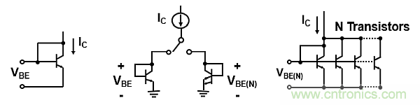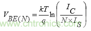 公式(2)顯示了許多并聯(lián)晶體管的基極-發(fā)射極的VBE(N)值。