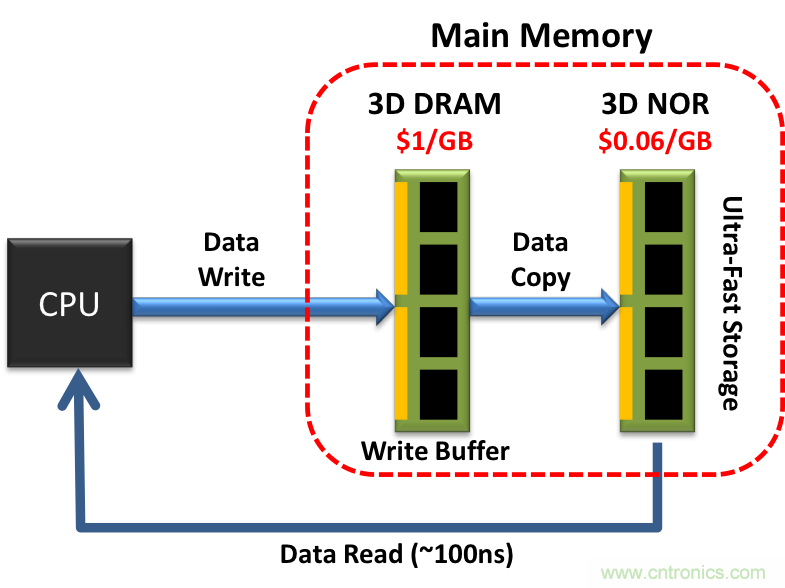 另一項建議是采用DDR4 NVDIMM,以取代DRAM作為主存儲器。非揮發(fā)性雙列直插式存儲器模塊(NVDIMM)有很多種類型;相較于其他以儲存為導(dǎo)向的NVDIMM,DDR4 NVDIMM能夠表現(xiàn)得和DRAM一樣快,而且可以作為主存儲器。幾年前,英特爾的3D XPoint看好DDR4 NVDIMM作為切入點,因為3D XPoint擁有NOR型閃存讀取延遲低(低于100ns)的優(yōu)點,因而能像DRAM一樣快速運作。它也不需要預(yù)測軟件,因而能夠始終保持高性能。此外,采用單層儲存(SLC)的SLC NOR閃存具有很高的耐久性。因此,DDR4 NVDIMM的NOR閃存能夠取代DRAM,并以大量的主存儲器大幅提升系統(tǒng)性能,如圖3所示。