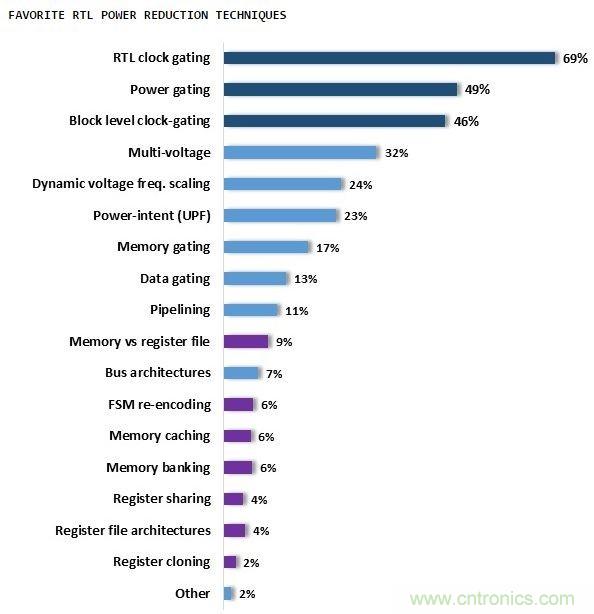 除了上述這些方法,高效的低功耗技術(shù)還有許多,比如襯底反偏(加反向電壓降低襯底漏電),多閾值單元(Multi-Vth cell)等等設計方法。下圖是一些比較熱門的RTL級低功耗技術(shù)。