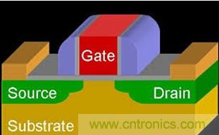 這里,我們盡量把事情說簡單。上面這副示意圖中就是一個典型的半導體晶體管。其中兩個綠色的部分(源極Source和漏極Drain)分別是晶體管的兩級,類似電池的兩級。紅色的部分就是用來控制這兩個電極的通斷的,而通斷分別對應數(shù)字化時間的1和0。所謂數(shù)字化世界其實也就是非常非常多的晶體管的通斷變化組合出來的。紅色柵極(Gate)的寬度就是我們通常所說的溝槽寬度或者線寬——我們通常說的多少多少nm就是指的這個寬度。