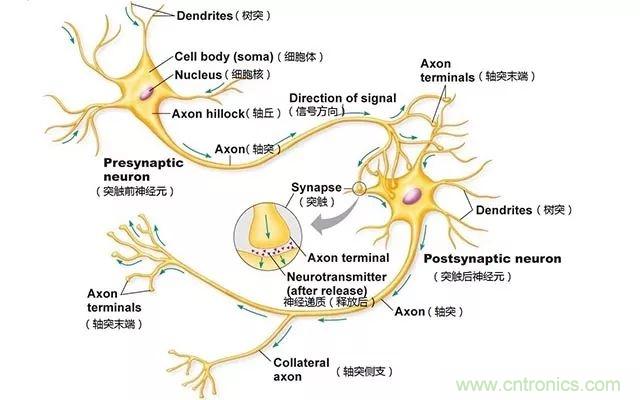 人腦神經(jīng)元在接受到刺激后,其細(xì)胞膜內(nèi)外帶電離子分布將發(fā)生變化,因而形成電位差,電位差將沿著神經(jīng)細(xì)胞軸突、樹突雙向傳導(dǎo),形成脈沖電流。而當(dāng)該電信號傳遞到突觸時,突觸前神經(jīng)元將釋放神經(jīng)遞質(zhì)(如多巴胺、腎上腺素)由突觸后神經(jīng)元接受神經(jīng)遞質(zhì)產(chǎn)生興奮(該過程單向傳遞),并向下傳遞作用與人體反應(yīng)器并發(fā)生反應(yīng)。