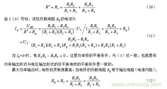 (3)Rg相對(duì)橋臂電阻可比擬時(shí)的非平衡電橋(功率輸出形式)當(dāng)負(fù)載電阻Rg與橋臂電阻可比擬時(shí),則電橋不僅有輸出電壓Ug,也有輸出電流Ig,也就是說(shuō)有輸出功率,此種電橋也稱為功率橋。功率橋可以表示為圖3(a)。
