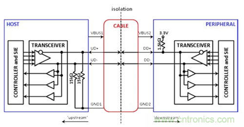 一種可能的隔離方法如圖2a所示。圖中,虛線表示隔離在理論上將USB電纜分割。D+和D–的狀態(tài)信息可以跨越隔離柵,但電流不能。GND1節(jié)點(diǎn)(上游的接地基準(zhǔn))現(xiàn)在與GND2節(jié)點(diǎn)(下游的接地基準(zhǔn))相互分離。不幸的是,隔離使主機(jī)無法“看到”下游的上拉電阻,而外設(shè)無法“看到”上游的下拉電阻。因此,需要使用一些額外的電阻,如圖2b所示,以便跨越隔離模仿相應(yīng)連接。在這個“透明”概念中,主機(jī)與外設(shè)之間的通信方式和圖1中的非隔離式連接十分類似。透明的USB