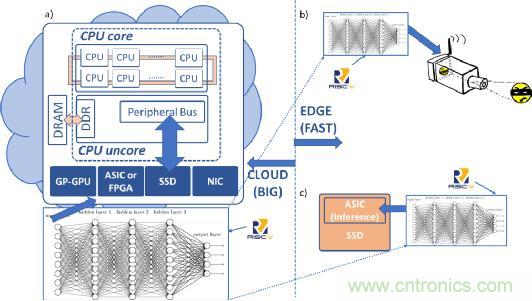 在圖1a中,云數(shù)據(jù)中心服務(wù)器利用在大型大數(shù)據(jù)集上訓(xùn)練的深度學(xué)習(xí)神經(jīng)網(wǎng)絡(luò)來(lái)執(zhí)行機(jī)器學(xué)習(xí)的功能。在圖1b中,邊緣設(shè)備中的安全攝像機(jī)采用經(jīng)過(guò)大數(shù)據(jù)訓(xùn)練的推理引擎來(lái)實(shí)時(shí)識(shí)別圖像(快速數(shù)據(jù))。在圖1c中,智能固態(tài)硬盤(pán)設(shè)備采用推理引擎進(jìn)行數(shù)據(jù)識(shí)別和分類(lèi),從而有效地利用了此設(shè)備的帶寬。圖1展示了RISC-V內(nèi)核的潛在機(jī)會(huì),它可以自由地添加專(zhuān)有的及未來(lái)標(biāo)準(zhǔn)化的矢量指令,這些指令對(duì)于處理深度學(xué)習(xí)和推理技術(shù)相當(dāng)有效。