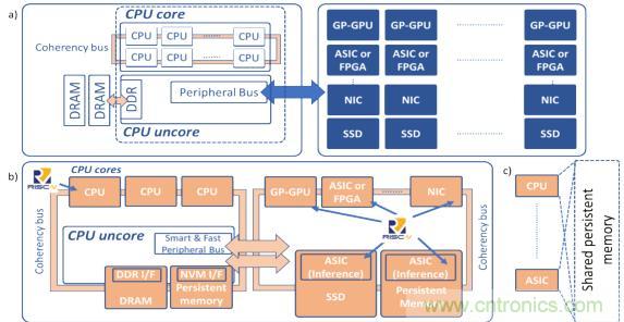 在圖2a中,傳統(tǒng)的計(jì)算體系結(jié)構(gòu)由于把一條慢速外設(shè)總線用于快速存儲(chǔ)器及計(jì)算加速設(shè)備,其能力已達(dá)到其極限。在圖2b中,未來(lái)的計(jì)算體系結(jié)構(gòu)采用了開(kāi)放接口,能夠?yàn)槠脚_(tái)上所有的計(jì)算資源提供統(tǒng)一并支持高速緩存一致性的訪問(wèn)方式來(lái)訪問(wèn)共享持久內(nèi)存,(這稱為以數(shù)據(jù)為中心的體系結(jié)構(gòu))。在圖2c中,所部署的設(shè)備能夠使用相同的共享內(nèi)存,從而減少了不必要的數(shù)據(jù)復(fù)制。