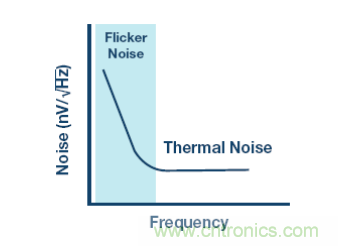 集成輸入緩沖器還有其它挑戰(zhàn)。Σ-Δ 型調(diào)制器可在低頻率時(shí)提供極低噪聲,但所有其它元件(比如輸入緩沖器)都會使熱噪聲增加,而更嚴(yán)重的則是低頻閃爍噪聲,如圖 4 所示。