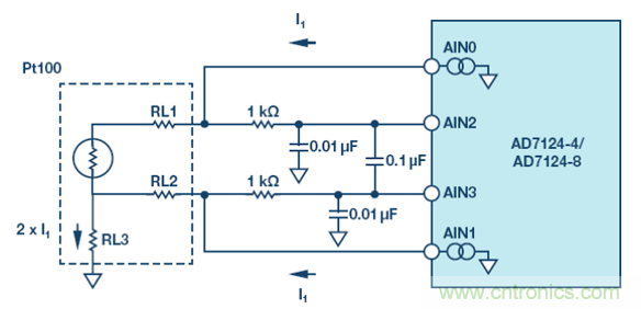 測量溫度并消除引線誤差的傳統(tǒng)方法如圖 10 所示。本例中,集成 PGA 的 Σ-Δ 型 ADC AD7124-8 的內(nèi)部電流源以相同電流驅(qū)動(dòng)雙線式 RTD,在兩個(gè)引線上產(chǎn)生相同的失調(diào)誤差,其值與引線電阻成正比。