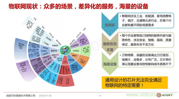 天軟信息在NB-IoT這個產(chǎn)業(yè)鏈上扮演的角色是要打造一個端到端的運營方案,從芯片到運營整體,黃總指出,通用設計的芯片無法滿足物聯(lián)網(wǎng)的特定需要,物聯(lián)網(wǎng)是一個海量兼容的設備,不同領域的設備有著完全不一樣的形態(tài)要求,所以提出了一個觀念叫做服務定義芯片。傳統(tǒng)的芯片設計行業(yè),芯片設計商定義一個芯片是根據(jù)市場需求和發(fā)展趨勢來定義這個芯片的規(guī)格,然后交由芯片制造商去做具體的制造的工藝設計規(guī)劃,而現(xiàn)在的模式是把設計服務這塊獨立出來,也就是說真正了解市場,接觸這個市場對這個行業(yè)發(fā)展把握非常精準的一些公司,他們會提出來定義具體的一款芯片需求,定義出來的芯片交到以前的芯片設計公司來完成設計的服務,芯片制造商來完成這個芯片的制造,天軟信息現(xiàn)在正在走的就是這樣的模式。