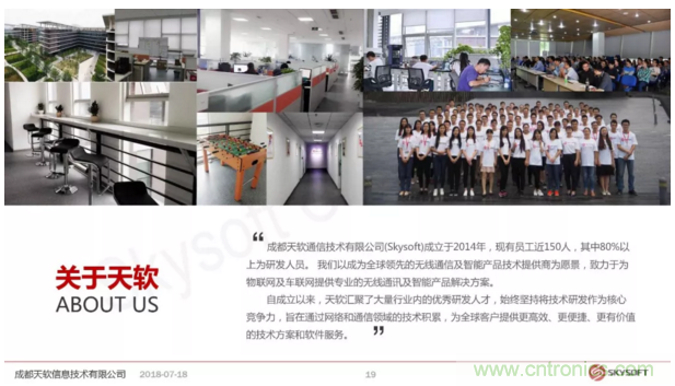 天軟信息成立于2014年,現(xiàn)有員工近150人,其中80%為研發(fā)人員。公司以成為全球領先的無線通信及智能產(chǎn)品技術提供商為愿景,致力于為物聯(lián)網(wǎng)及車聯(lián)網(wǎng)提供專業(yè)的無線通訊及智能產(chǎn)品解決方案。Skysoft是西部為數(shù)不多的擁有獨立綜合通信測試實驗室,并能提供LTE終端產(chǎn)品/模塊、無線路由器、車載通信及多媒體等軟硬件研發(fā)能力的高新技術企業(yè)。