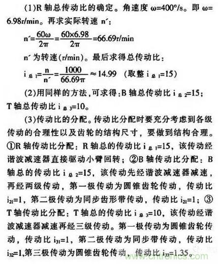 諧波齒輪減速器是一種新型的機械傳動變速機構。 與普通齒輪傳動相比,具有體積小,重量輕,結構簡單。它與傳動比相當?shù)钠胀p速器比較,其零件減少50%。 體積和重量均減少l,3左右或更多。傳動比范圍大(單級傳動比為40~350,多級傳動比可達1600~100000),傳動效率高(單級傳動效率饑≥85%),傳動精度高。承載能力強等特點。 根據(jù)所選擇的電機,選擇型號為SGMAH—OIA,額定功率為loo W,額定轉(zhuǎn)矩為0.318 N·m,額定轉(zhuǎn)速為 3000 drain的交流伺服電動機。同時選擇XBl諧波減速機,機型為25,減速比為40,輸出力矩為1.0N·m,輸入轉(zhuǎn)速為3000 r/min。為了訂貨和維修方便,三軸均采用同一種減速器。