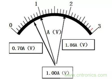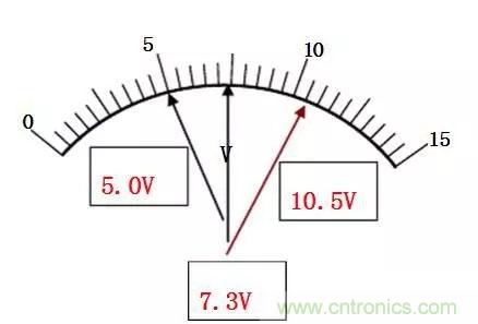 表盤的最小分度值為0.5V/格,雖能準(zhǔn)確讀到0.5V,但誤差仍出現(xiàn)在最小分度值的同一數(shù)位上,即以V為單位的十分位。其估讀法則是:將最小分度分為五等分,即為0.1V。