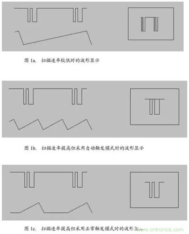 圖1 是這種情況的圖解,在圖1 中,左側(cè)上方是被觀測的波形,下方是掃描波形,右側(cè)是波形的顯示。圖1a中掃描速率較低,不便于觀察波形的細(xì)節(jié);圖1b將掃描速率提高,采用自動觸發(fā)模式,這時(shí)顯示的波形是不清晰的,有混疊現(xiàn)象;圖1c中的掃描速率與圖1b相同,但采用正常觸發(fā)方式,僅在有觸發(fā)時(shí)才進(jìn)行掃描,因而顯示清晰的波形。