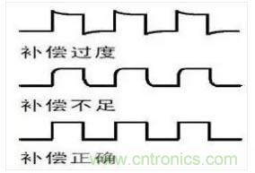3.如果波形不正確,請調(diào)整探頭。如下圖三所示,直至波形為上面的補(bǔ)償正確波形。