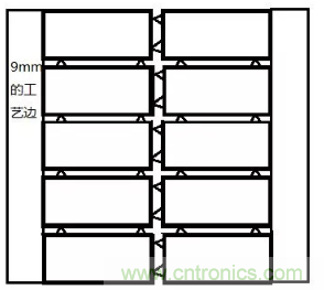 工藝邊用于在自動(dòng)化貼片時(shí),貼片機(jī)需要夾住板子的邊緣進(jìn)行貼片,通常只需要加兩邊即可。工藝邊寬度的選擇通常比較寬泛,可以選常用的9mm。注意工藝邊只是在貼片生產(chǎn)時(shí)用到,在元件組裝完后就可以掰掉的。開(kāi)發(fā)人員在畫(huà)板子的時(shí)候不需要把工藝邊給畫(huà)上去,但是需要在發(fā)給廠家的文件中需要注明。工藝邊如下圖所示: