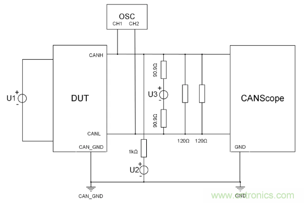 調(diào)節(jié)電壓源U3,逐步將差分電平調(diào)到隱性電平上限值0.5V,判斷DUT是否能夠正常發(fā)送報文,若能,則表示測試通過。