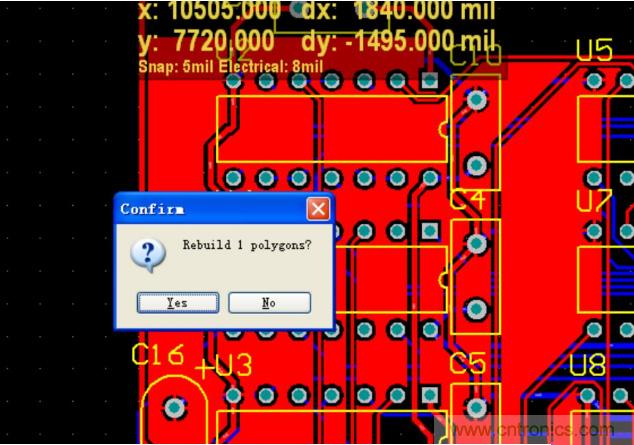 系統(tǒng)會(huì)提示你進(jìn)行重新鋪銅,點(diǎn)擊 YES 。