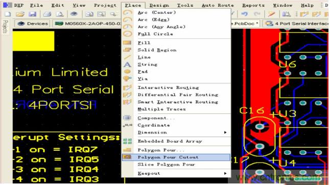 有時(shí)我們?cè)阡佂赉~之后還需要去刪除一些碎銅,現(xiàn)在可以很方便的實(shí)現(xiàn),點(diǎn)擊 Place—Polygon Pour Cutout