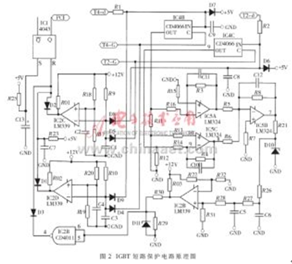 由對圖1所示電路的分析,可以得到IGBT短路保護(hù)電路的原理電路圖,如圖2所示。在圖2所示電路中, IC4及其外圍器件構(gòu)成選通邏輯電路,由IC5及其外圍器件構(gòu)成濾波及放大電路,IC2及其外圍器件構(gòu)成門限比較電路,IC1及其外圍器件構(gòu)成保持電路。正常情況下,D1、D2、D3的陰極所連接的IC2D、IC2C及CD4011的輸出均為高電平,IC1的輸出狀態(tài)不會改變。假設(shè)由于某種原因,在給T2發(fā)驅(qū)動信號的時候,H型橋式PWM變換電路的左半橋下管T2的管壓降異常升高(設(shè)電平值為“高”),即T2-d端電壓異常升高,則該高電平UT2-d通過R2加在D8的陰極;同時,發(fā)給T2的高電平驅(qū)動信號也加在二極管D5的陰極。對IC2C來說,其反相輸入端為高電平,若該電平值大于同相輸入端的門檻電平值的話,則IC2C輸出為“低”。該“低”電平通過D2加在R-S觸發(fā)器IC1的R輸入端,使其輸出端Q的輸出電平翻轉(zhuǎn),向控制系統(tǒng)發(fā)出IGBT故障報警信號。如果是由于右半橋下管T4的管壓降異常升高而引起IC2D輸出為“低”,則該“低”電平通過D1加在R-S觸發(fā)器IC1的R輸入端,使其輸出端Q的輸出電平翻轉(zhuǎn),向控制系統(tǒng)發(fā)出IGBT故障報警信號。由IC5A和IC5C及其外圍器件構(gòu)成的濾波及放大電路將選通電路送來的描述IGBT管壓降的電壓信號進(jìn)行預(yù)處理后,送給由IC5B構(gòu)成的加法器進(jìn)行運算處理。若加法器的輸出電平大于由R22和R32確定的門檻電平,則會使R-S觸發(fā)器IC1的R端的第三個輸入端為“低”,也向控制系統(tǒng)發(fā)出IGBT故障報警信號。改變由R22和R32確定的門檻電平,就可以靈活地改變這第三路報警信號所代表的物理意義,從而靈活地設(shè)計保護(hù)電路。圖2中的端子T4-d、T2-d,分別接在T4、T2的集電極上,T4-G、T2-G分別接IGBT器件T4、T2的驅(qū)動信號。在電路設(shè)計時應(yīng)該特別注意的是,D8、D5、D9、D4必須采用快速恢復(fù)二極管。