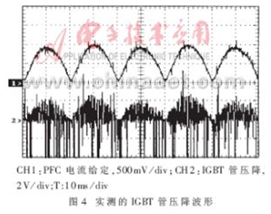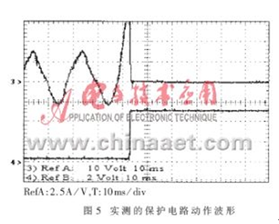圖5所示為IGBT過流時實際檢測到的PFC電感中流過的電流及保護(hù)電路動作的波形。