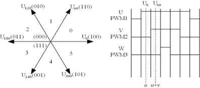如圖2所示,電機的驅(qū)動采用了七段式的空間矢量法(SVPWM,SpaceVectorPWM),利用六個依次相差60度的基本矢量和全0矢量(與全1矢量等效),根據(jù)不同的作用時間合成按給定轉(zhuǎn)速作圓周轉(zhuǎn)動的旋轉(zhuǎn)矢量。