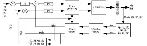 電機通過單電流采樣得到兩個采樣電流值,通過電流識別方法,計算出三相電流,利用Clarke和Park變換將電流映射到d、q坐標(biāo)系下,估算出角度和速度值,通過結(jié)合了積分分離的PI控制算法,完成對電機的反饋控制,然后經(jīng)過Park逆變換,生成了新的SVPWM波,完成一次循環(huán)。這里用到的位置、速度估算函數(shù)由于篇幅所限,將另做描述。