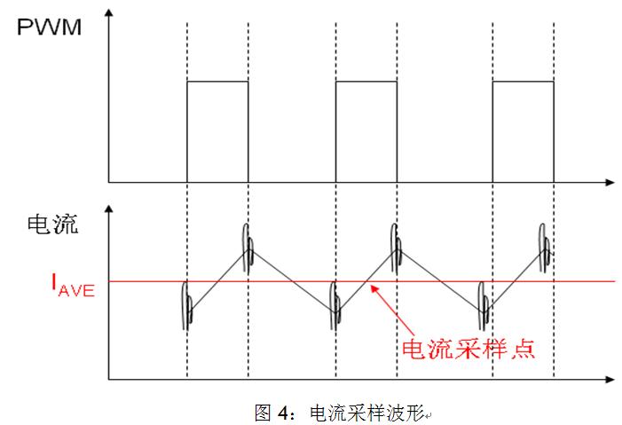 2) 能夠在PWM的開通期間特定時刻觸發(fā)A/D采樣;因為在PWM逆變器帶感性負(fù)載的控制系統(tǒng)中,由于系統(tǒng)的一些寄生參數(shù)導(dǎo)致PWM在開通和關(guān)斷期間電機(jī)的相線上出現(xiàn)振鈴(如圖4所示),這些振鈴會耦合到A/D采樣的回路中,因此我們應(yīng)避開在PWM開關(guān)過程中進(jìn)行A/D采樣。如果我們在PWM開通期間的中點(diǎn)觸發(fā)電流采樣,我們將會得到電流的平均值,這將有利于我們對電流補(bǔ)償?shù)目刂啤?