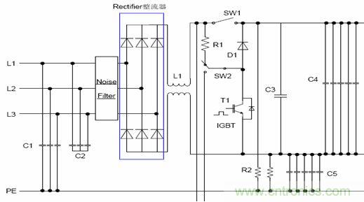 電源系統(tǒng)是指將輸入系統(tǒng)的動力電源轉(zhuǎn)換成用于驅(qū)動交流電機(jī)的直流或交流電源,根據(jù)實(shí)際控制方式的不同,一般可以分為“交直交”電壓源型逆變電路,“交直交”電流源型逆變電路,“交交”型變頻電路以及泵電源電路等。圖1是“交直交”電壓源型電源系統(tǒng)的典型電路,如果將并聯(lián)的濾波電容去掉,在直流側(cè)串聯(lián)一個(gè)大濾波電感則為“交直交”電流源型電路。