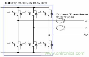 功率開關(guān)器件通過根據(jù)來自微處理器板的控制信號控制大功率輸出器件的關(guān)斷和導(dǎo)通,來實(shí)現(xiàn)對交流電機(jī)的輸出電流和電壓的控制。根據(jù)控制方式的不同,其輸出方式由方波輸出逐漸發(fā)展到PWM輸出或SPWM輸出。開關(guān)器件也由原來的GTR,MOSFET,發(fā)展到IGBT,IPM等。參見下面的典型IGBT逆變輸出電路。