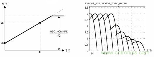 當(dāng)電機(jī)在額定頻率以上調(diào)速時(shí),逆變器的輸出頻率可以繼續(xù)升高,但是輸出端電壓只能維持在額定輸入值,此時(shí)定子磁通和調(diào)速頻率成反比下降,異步電機(jī)的工作狀態(tài)等同于直流電機(jī)的弱磁升速,電機(jī)的輸出扭矩隨磁通變化,輸出扭矩隨速度增加逐漸變小為恒功率工作模式。