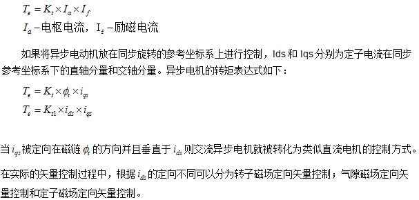 矢量控制是指根據(jù)電機(jī)運(yùn)行狀況同時(shí)控制輸出量的幅值和相位。其基本的工作原理是通過電機(jī)內(nèi)以同步轉(zhuǎn)速旋轉(zhuǎn)的參考d-q參考坐標(biāo)系的數(shù)學(xué)方法,解藕出控制電機(jī)勵磁方向的電流分量Id和控制電機(jī)的轉(zhuǎn)矩方向的分量Iq,從而可以將異步電機(jī)的控制方法等效為傳統(tǒng)直流電機(jī)的控制。