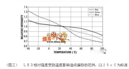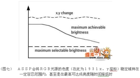 另一點相當重要,同時必須注意的是,當LED使用時間越久,光輸出強度就會降低,因此經(jīng)過一段時間后,RGB?。蹋牛南到y(tǒng)的最大可輸出亮度將會下降,雖然在大部分的應用事實上都可以接受逐漸且穩(wěn)定的亮度衰減,但有時無法接受的是RGB發(fā)光系統(tǒng)色度的變化,ASSP擁有能夠穩(wěn)定控制RGB發(fā)光系統(tǒng)光度衰減的功能,例如維持色度的穩(wěn)定在一定的容忍度內,甚至當最高可輸出亮度下降時。