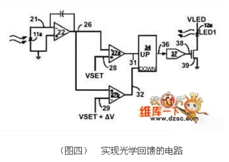 在(圖四)中,標記為22的積分電路可以輸出一個受到光二極管(11a)上光量控制的電壓,這個電壓與VSET比較,比較器的輸出能控制計數(shù)器數(shù)值的增加或減少,計數(shù)器的輸出則是用來推動一個數(shù)字模擬轉換器(37),進而控制LED的驅動電流。