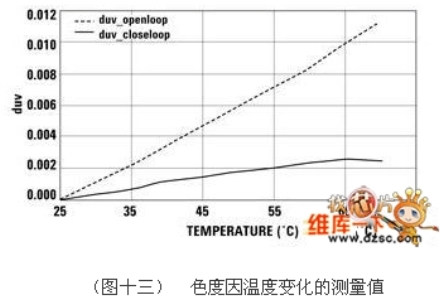 (圖十三)顯示了開回路與閉回路RGB光源系統(tǒng)的效能差別,實驗采9000K白色目標色進行并使用duv做為評比指標。