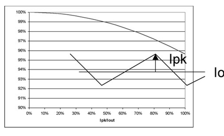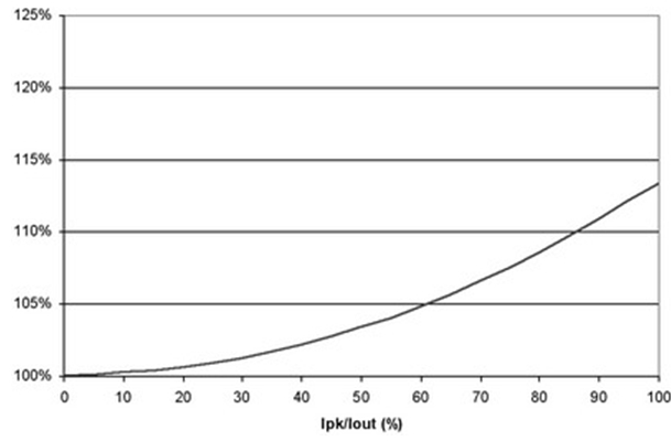 圖4 也闡明了即使在紋波電流較大的時候,對功耗也沒有重大影響。例如,50%的紋波電流僅增加不足5%的功率損耗。當(dāng)大大超過此水平時,需要減小電源的DC電流以保持結(jié)溫不變,從而維持半導(dǎo)體的使用壽命。經(jīng)驗法則顯示,結(jié)溫每降低10%,半導(dǎo)體使用壽命就會延長兩倍。并且,許多設(shè)計都傾向于更小的紋波電流,這是因為電感器的限制。絕大多數(shù)電感的設(shè)計處理能力小于20%的Ipk/Iout紋波電流比率。