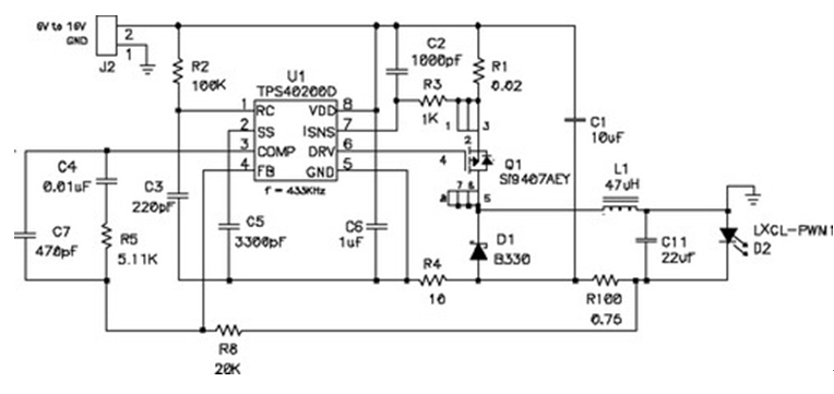在輸出電壓始終小于輸入電壓的情況下,應(yīng)使用降壓穩(wěn)壓器,圖5顯示了該拓?fù)浣Y(jié)構(gòu)。在該電路中,對電源開關(guān)的占空比 (duty factor) 進(jìn)行了控制,以在輸出濾波器電感 L1 上確立平均電壓。當(dāng)FET開關(guān)閉合時(TPS5430 內(nèi)部),其將輸入電壓連接到電感器,并在L1中構(gòu)建電流。D2為環(huán)流二極管 (catch diode),可提供開關(guān)斷開時的電流路徑。電感器可對流過LED的電流起到平滑的作用,該工作可通過用電阻監(jiān)控(測量)LED電流,并將電壓與控制芯片內(nèi)部的參考電壓進(jìn)行比較,最終進(jìn)行調(diào)節(jié)。如果電流太低,則占空比增加,平均電壓也上升,從而也導(dǎo)致了電流的升高。該電路具有極佳的效率,因為電源開關(guān)、環(huán)流二極管以及電流感測電阻上的壓降非常低。