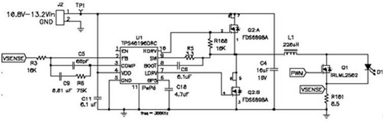 通常需要對 LED 進(jìn)行調(diào)光。例如,需要調(diào)節(jié)顯示器或建筑照明的亮度。實現(xiàn)上述目標(biāo)有兩種方法:降低 LED 的電流,或快速對 LED 進(jìn)行開關(guān)操作。更有效率的方法是降低電流,因為光輸出并不完全與電流呈線性關(guān)系,并且,LED 的色譜在電流小于額定值時會發(fā)生變化。人們對亮度的感知是指數(shù)型的,因此,調(diào)光可能需要對電流進(jìn)行很大更改,這會對電路設(shè)計造成很大的影響??紤]到電路的容差,滿電流值工作時,3%的調(diào)節(jié)誤差可以造成10%負(fù)載時的30%或更高的誤差。通過電流波形的脈寬調(diào)制 (PWM) 進(jìn)行調(diào)光更為準(zhǔn)確,盡管這種方法存在響應(yīng)速度問題。在照明和顯示器應(yīng)用上,PWM頻率高于 100Hz,以使肉眼感覺不到閃爍。10% 的脈沖寬度在ms量級內(nèi),并要求電源的帶寬大于 10kHz,此項工作可以通過圖8(A 與 C)中簡單的環(huán)路完成。圖9為帶 PWM 調(diào)光功能的降壓功率級電路。在本例中,LED 輕松地閉合/斷開電路。通過這種方式,控制環(huán)路總是處于激活狀態(tài),并實現(xiàn)了極快的瞬態(tài)響應(yīng)。