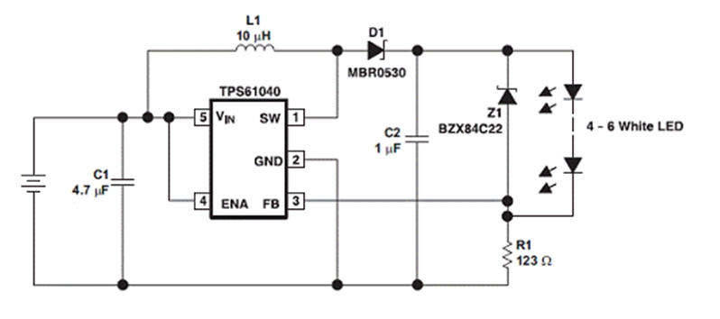 以下電路可生成 101mA 的恒定電流,能為 PDA 和數(shù)碼相機等便攜式應(yīng)用驅(qū)動高達(dá) 6 個白色 LED">LED。其輸入電壓工作范圍為 1.8 V 至 6 V,可以采用兩節(jié)堿性電池或鎳氫電池輸入(1.8 V 到 ~3 V)、三節(jié)堿性電池或鎳氫電池輸入(2.7 V 到 ~4.8 V)以及單體鋰離子電池輸入(3 V~4.2 V)。這種升壓轉(zhuǎn)換器采用 R1 來設(shè)置流過 LED">LED 的恒定電流。TPS61040 產(chǎn)品說明書 (SLVS413) 給出了本電路的詳細(xì)描述。