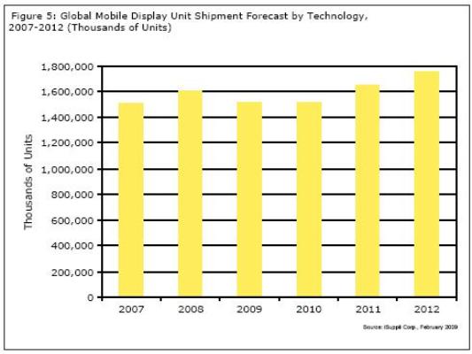 圖5所示為iSuppli公司對(duì)于2007-2012年手機(jī)顯示器市場(chǎng)的預(yù)測(cè)。